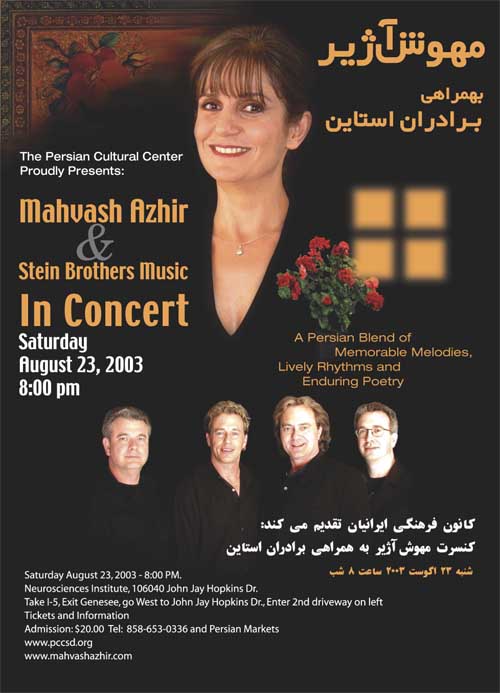 Mahvash Azhir & Eric Stein will be performing at the Bam Benefit Concert in the San Diego Museum for Contemporary Art on Friday, May 7th., 2004